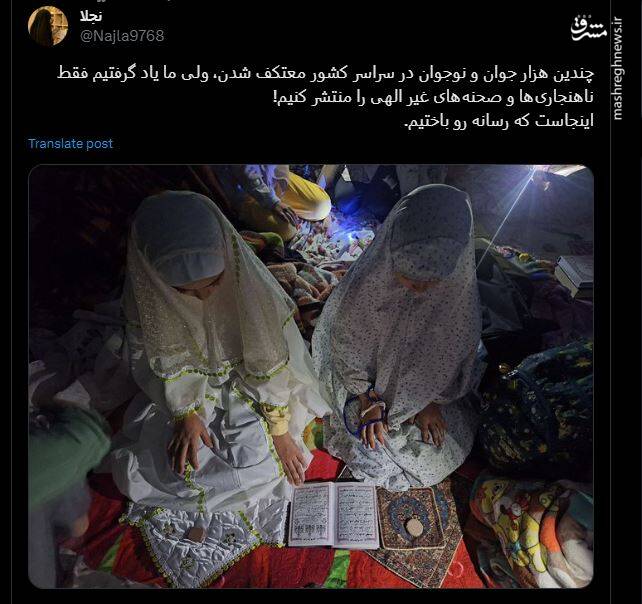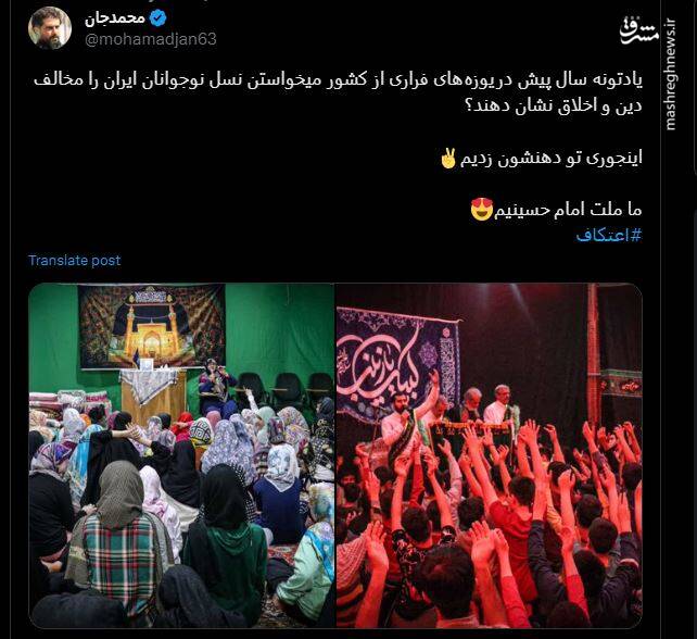 بازتاب اعتکاف امسال در شبکههای اجتماعی نیز جالب بود. کاربران فضای مجازی حضور دهههشتادیها و نوجوانان را چشمگیر و مایه افتخار دانستند. همچنین اشاراتی به اظهارنظرهای خصمانه معاندین در شبکههای اجتماعی و تحلیلهای رسانههای معاند داشتند. این افراد سال گذشته و حتی پیشتر مدعی شده بودند که نسل جدید(نسل زد) از تعلقات دینی و آیین عرفانی فاصله گرفته و مخالفاند. اما این حضور پرشور نوجوانان، باعث شده تا تصویری دقیق و صحیحی از افزایش میزان علاقه نوجوانان به آیین اسلامی به نمایش بگذارد.