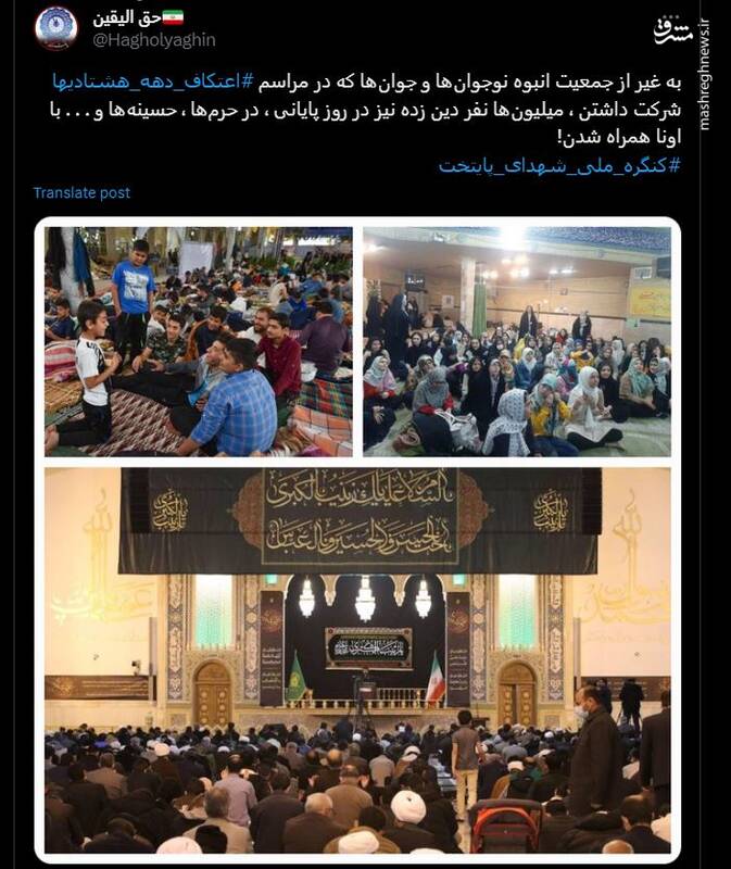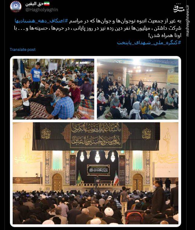برابر اعلام منابع رسمی، امسال نزدیک به یک میلیون نفر در کشور معتکف شدند و این آمار نسبت به سال قبل رشد سه برابری داشته است که بیش از ۹۰ درصد آنها جوان و نوجوان بودند. یعنی حدود ۳۵ درصد رشد نسبت به سال گذشته